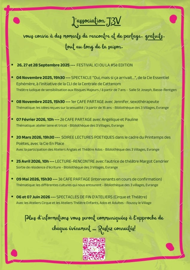 L'association J3V, active dans la transmission des Arts de la Scène et heureuse gestionnaire d'un petit lieu cosy - la Bibliothèque des 3 Villages à Evrange - a décidé de développer ses actions culturelles en proposant une série d'événements conviviaux au fil de l'année.